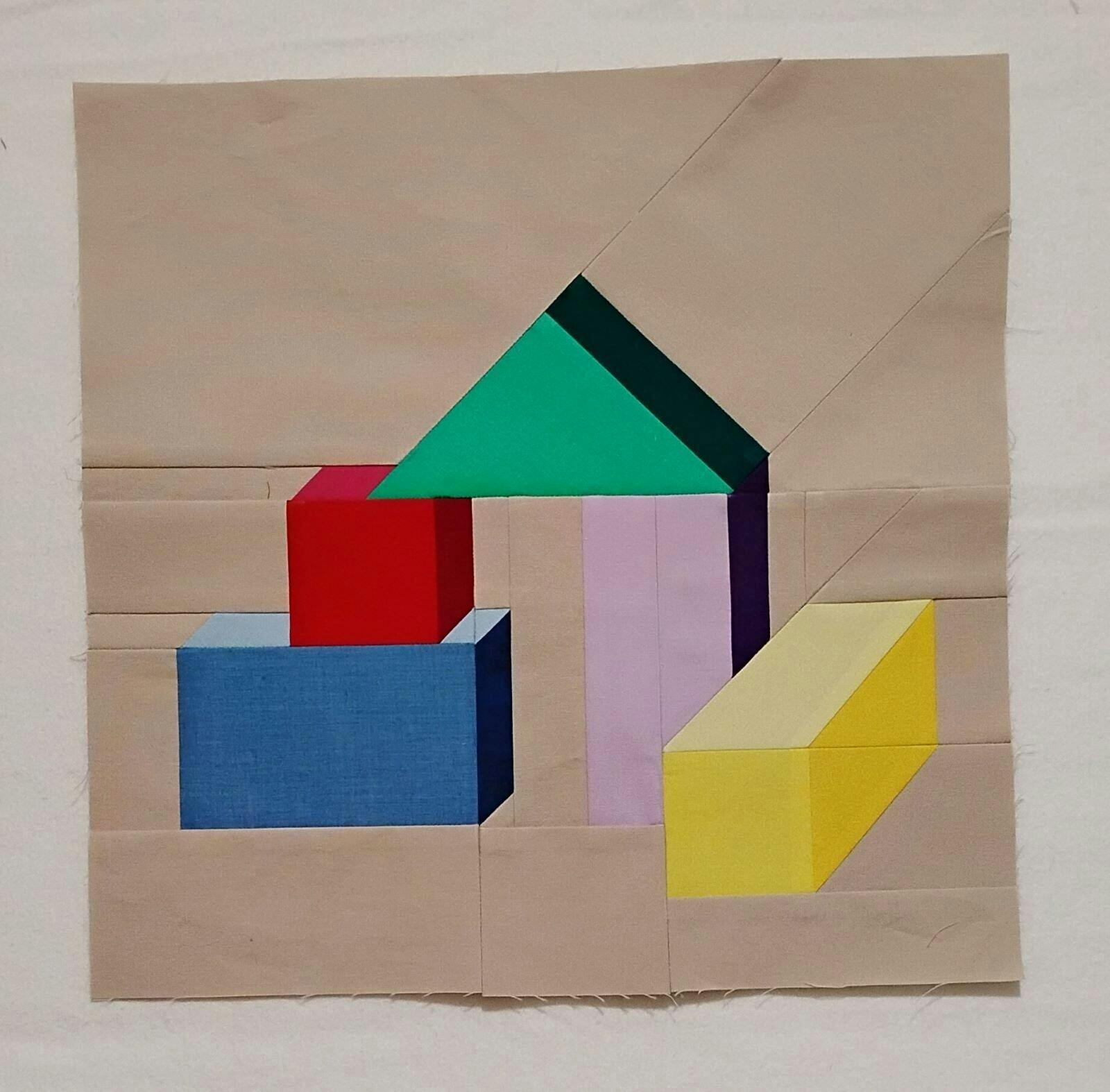 Wooden blocks are one of my favourite toys for kids. This quilt block features some of the basic shapes and is a fun block to practice your colour selections to make the 3D effect. Whether you need a block for a toy-themed quilt, a pillow for the play room, or just want to practice your 3D skills, this block is for you. Or how about turning the block into a fabric bag to store all the blocks in?