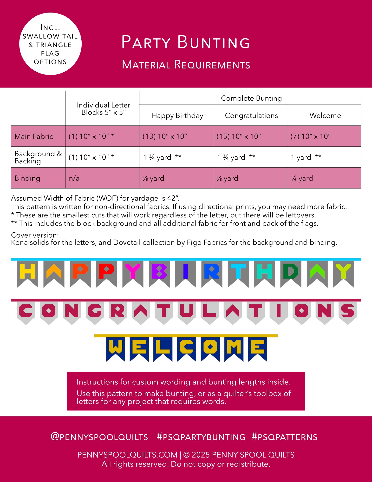 - full fabric requirements for three buntings - Happy Birthday, Congratulations, and Welcome
